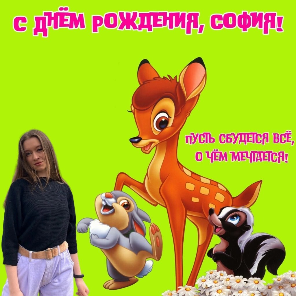 «София! По преданию имя София означает умная, мудрая, занимающаяся наукой... как здорово, когда к перечисленным характеристикам можно добавить, красивая, талантливая, творческая, добрая, увлеченная искусством и любящая детей! С днём рождения! Любви, смеха, радости, природных красок, любящих, преданных и верных друзей, здоровья всей семье!»